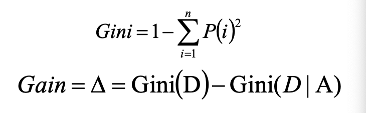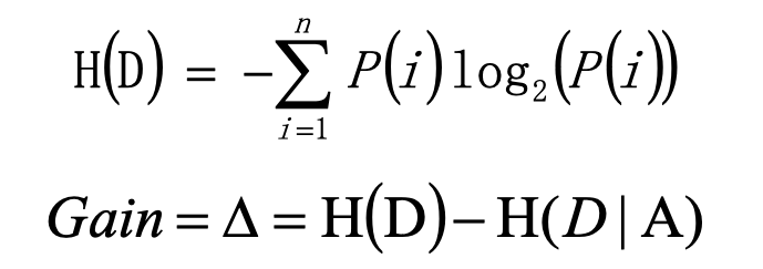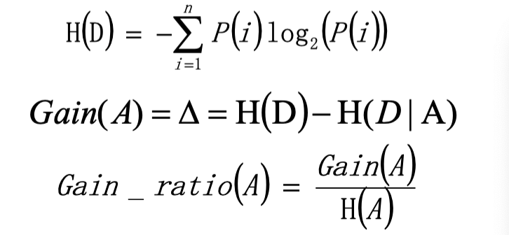 信息熵 H(D)用来描述系统信息量的不确定度,越混乱,信息熵越高。H(D|A)表示属性A的情况下的熵值。Gain值表示属性A对于系统统一性作出的贡献值,对比所有属性的Gain值,Gain值最高的属性适合做决策树的第一个节点。
