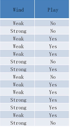 eg. 风力weak的情况有8次,风力strong的情况6次。week情况下,8次中有6次出去玩,2次不出去玩。strong的情况下,6次中有3次出去玩,3次不出去玩。