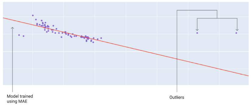 MAE:模型离离群值较远,但离大多数其他数据点较近。