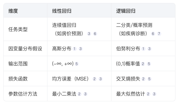 - 逻辑回归在结构上可视为 “线性回归 + sigmoid激活函数”,将连续值映射为概率,相当于比线性回归多了一道工序。
